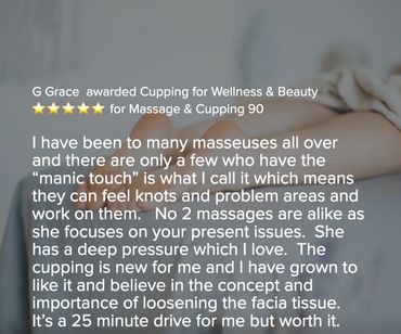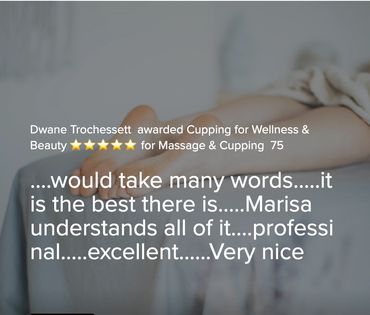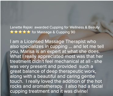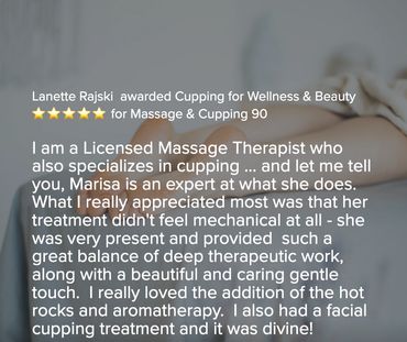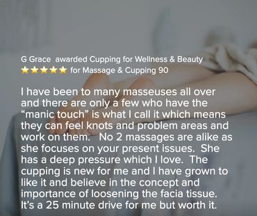 "Whether you come in for a treatment (whether it be cupping or massage ... or both!), my goal is to provide you with the best care. I believe I offer the best of all body treatments: Massage with Cupping. Cupping (decompression) fights gravity and reduces tension by the action of lifting. Massage therapy (compression) nurtures and